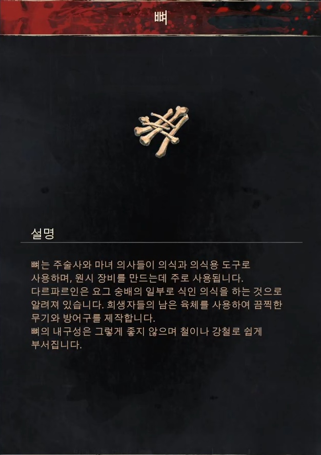 획득 방법 1.인간,특정 동물(악어,도롱뇽,셰일백등)의 사체에서 [도끼],[곡괭이]를 사용하여 채집할시 일정확률로 획득가능. 사용처 1.화살,무기등 제작재료로 사용됨. 2.[분쇄기]에서 [뼈]를 사용해 [뼛가루]획득 가능. 3.[화로 가마솥]에서 [뼈]10개,[부패의 가루]를 사용해 [오염된 뼈]획득 가능. ※[오염된 뼈]제작법을 획득하기 위해서는 [소환 지점]에서 [마녀 의사]업적을 획득하셔야합니다. 획득위치는 아래쪽에 추가 작성한 [마녀 의사] 로 검색하세요. |