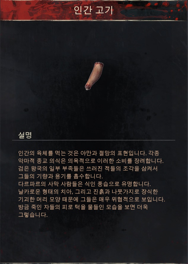 획득 방법 1.인간의 시체를 [도끼],[곡괭이],[식칼]을 사용하여 채집할시 일정확률로 획득. 사용처 1.[조리기]에 레벨3이상의 [요리사]노예를 투입할 경우 [사골 국물],[인간 고기]3개를 사용해 [정체 모를 고기 수프]획득 가능. 2.[액체 압착기]에서 [인간 고기]를 사용해 [혈액]획득 가능. 3.[조리기]에서 [인간 고기]10개,[그림자 꽃]을 사용해 [그림자 양념으로 양념한 인간 고기]획득 가능. ※[그림자 양념으로 양념한 인간 고기]는 동물의 변이를 일으킬때 사용되는 음식이다. |
