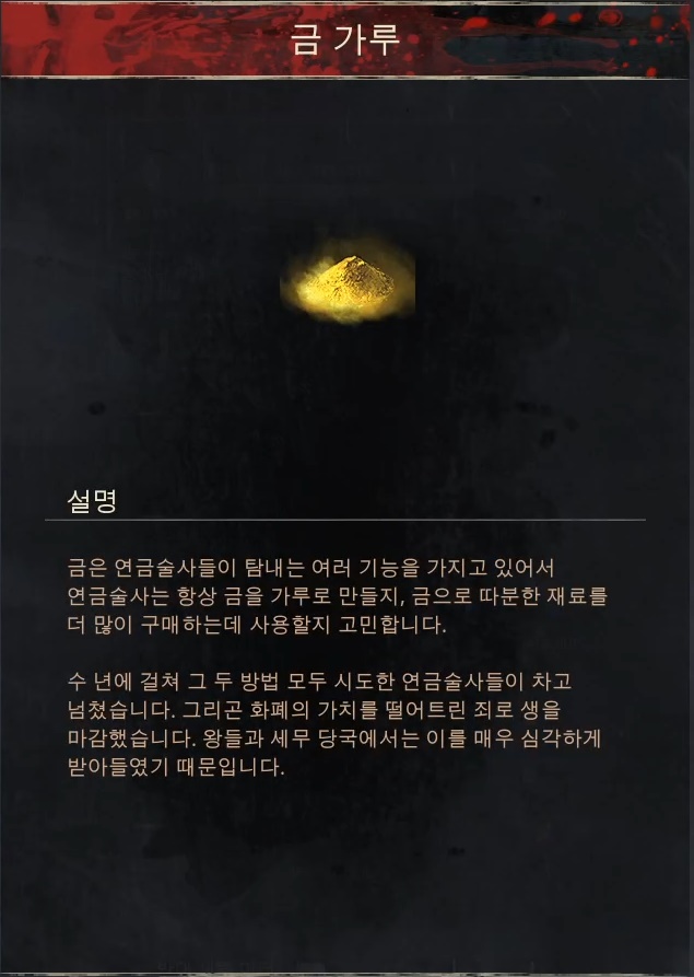 획득 방법 1.[분쇄기]에서 [금괴]를 사용해 [금 가루]10개획득 가능. 2.[분쇄기]에서 [금화]를 사용해 [금 가루]2개획득 가능. 사용처 1.[화로 가마솥]에서 [은 가루]2개,[금 가루],[이코르]를 사용해 [연금술 원재]획득 가능. |