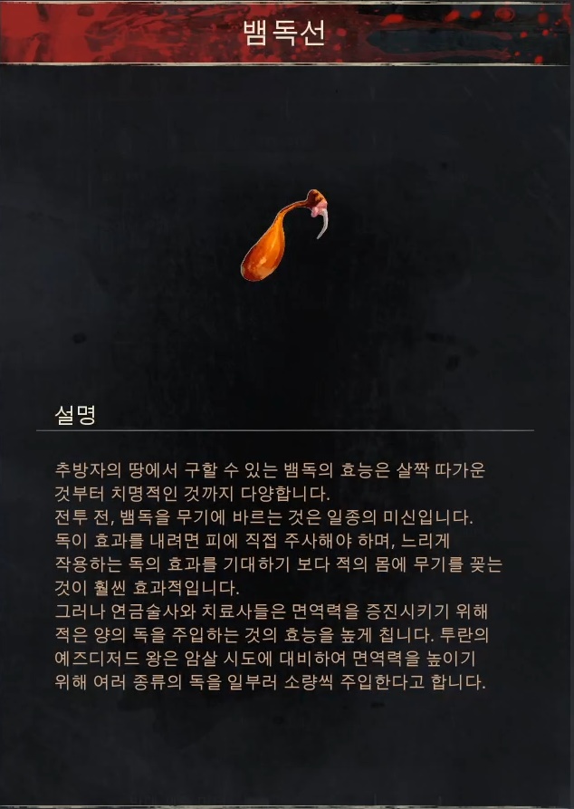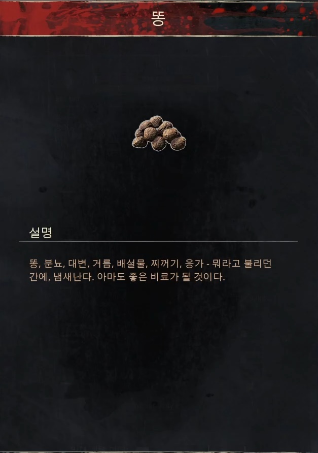 획득 방법 1.[액체 압착기]에서 [인간 고기]를 사용해 [혈액]획득 가능. 2.[분쇄기]에서 [팔 토막]을 사용해 [뼛가루]2개,[혈액]1개 획득 가능. 3.[분쇄기]에서 [다리 토막]을 사용해 [뼛가루]2개,[혈액]1개 획득 가능. 사용처 1.[퇴비 더미]에서 [퇴비]2개,[혈액]2개,[식은재]2개를 사용해 [농축 퇴비]획득 가능. 2.[연금술사 작업대]에서 [물이 담긴 유리병],[노란색 연꽃 가루],[혈액],[뼛가루]를 사용해 [한밤의 물약]획득 가능. ※[한밤의 물약]은 던전으로 입장할수있는 물약입니다. 3.[연금술사 작업대]에서 [물이 담긴 유리병],[노란색 연꽃],[혈액]3개,[식은재]10개를 사용해 [짐승의 기억의 물약]획득 가능. ※[짐승의 기억의 물약]은 속성 점수를 재설정하는 물약입니다. |