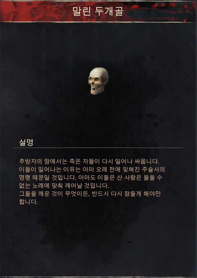 [마녀 의사] [오염된 뼈],[불안정한 생명부여],[안정적인 생명부여],[언데드 카파],[언데드 하이에나],[언데드 괴물] ![]() ![]() ![]() 정문쪽을 따라 쭉 계단을타고 올라와서 오른쪽으로 올라갈경우 한층더 올라가는 계단쪽 가기 바로전에서 획득가능. 읽을경우 마녀 의사를 획득합니다. |
