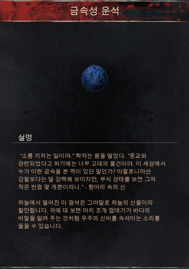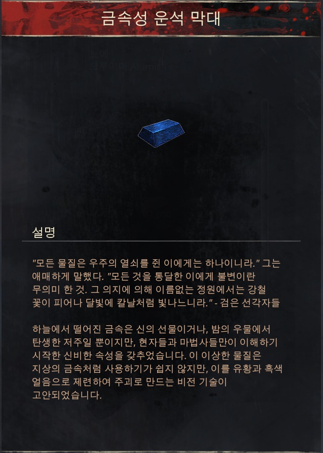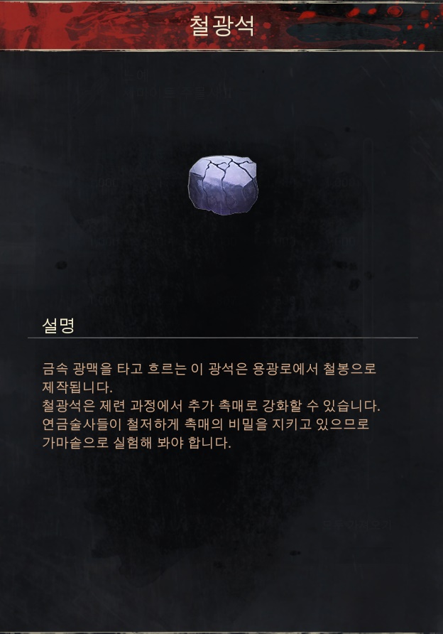 획득 방법 1.[연금술사 작업대]에서 [돌]2개,[이코르],[악마의 피]를 사용해 [오염된 돌] 획득 가능. ※[기록 보관소]안쪽에 있는 기록 관리자 에게서 [(지도 제작자)학습하기] 를통해 레시피를 해금하실수 있습니다. 사용처 1.[지도실]을 만드는데 사용됩니다. |