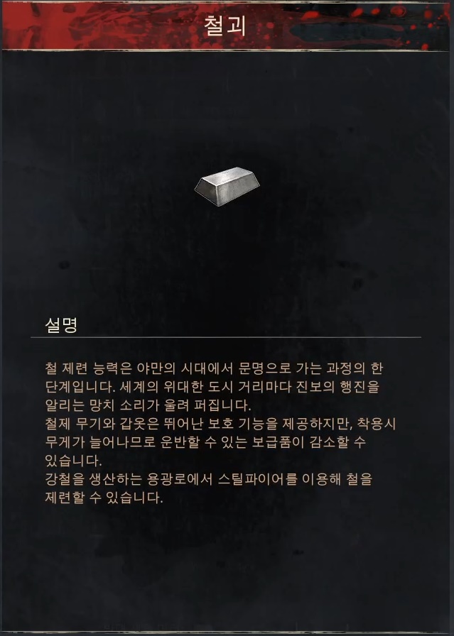획득 방법 1.[용광로]에서 연료([식물 섬유],[나뭇가지],[목재],[석탄])와 [철광석]을 넣어서 [철괴]로 제작. 2.[대장장이 작업대]에서 [철 보강재]를 재료로 [철괴]획득 가능. 사용처 1.무기,도구,건물,강화부품 제작재료로 사용됨. 2.[대장장이 작업대]에서 [철괴]를 재료로 [철 보강재]획득 가능. 3.[용광로]에서 [철괴]5개,[스틸파이어]를 재료로 [강철괴]획득 가능. |