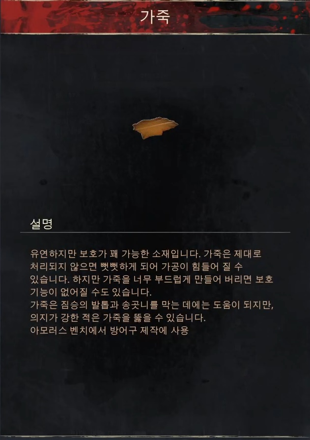 획득 방법 1.[무두장]에서 [두꺼운 생가죽],[나무껍질]을 사용해 [두꺼운 가죽],[타르]획득 가능. 사용처 1.무기,도구,방어구,강화 부품,옷 제작등에 사용됨. 2.[무두장이 작업선반]에서 [가죽],[두꺼운 가죽],[연금술 원재],[기름]을 사용해 [강화가죽]획득 가능. |