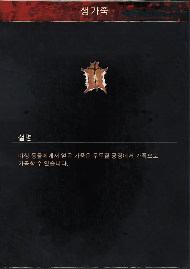 획득 방법 1.인간,특정 동물(사슴,가젤,셰일백등)의 시체를 [도끼],[곡괭이]를 사용하여 채집할시 일정확률로 획득. 2.[무두장이 작업선반]에서 [하이에나 털가죽],[고양잇과 동물의 털가죽],[늑대 털가죽],[박쥐 가죽],[파충류 생가죽]을 재료로 [생가죽]획득 가능. 사용처 1.강화 부품,옷, 제작재료로 사용됨. 2.[무두장]에서 [생가죽],[나무껍질]을 사용해 [가죽],[타르]획득 가능. |