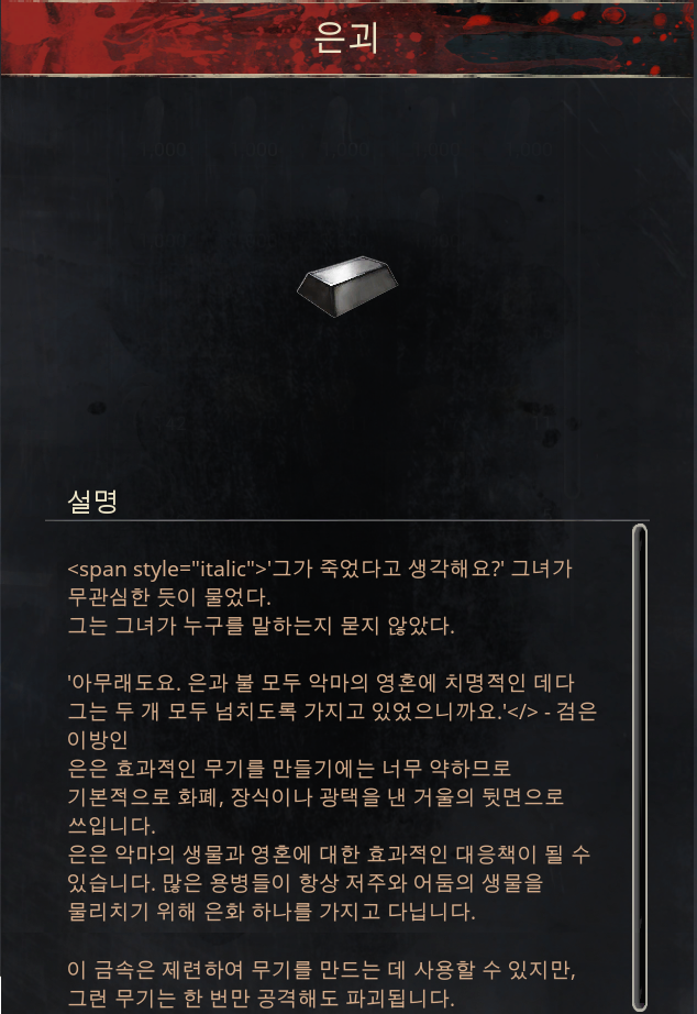 획득 방법 1.[주조 작업선반]에서 [화폐 형틀],[은괴]를 사용해 [은화]획득 가능. 2.몇몇 상자는 [은괴],[은화],[금괴],[금화]중 랜덤으로 드랍하는 상자에서 획득가능합니다. 사용처 1.상인과의 거래에 사용됩니다. 2.[분쇄기]에서 [은화]를 사용해 [은 가루]2개획득 가능. |