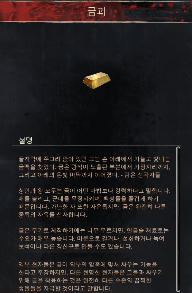 2.몇몇 상자는 [은괴],[은화],[금괴],[금화]중 랜덤으로 드랍하는 상자에서 획득가능합니다. 획득 방법 1.[용광로]에서 [금 광석]3개를 사용해 [금괴]획득 가능. 2.몇몇 상자는 [은괴],[은화],[금괴],[금화]중 랜덤으로 드랍하는 상자에서 획득가능합니다. 사용처 1.[분쇄기]에서 [금괴]를 사용해 [금 가루]10개획득 가능. 2.[주조 작업선반]에서 [화폐 형틀],[금괴]를 사용해 [금화]획득 가능. |
