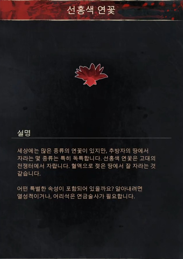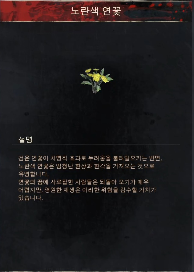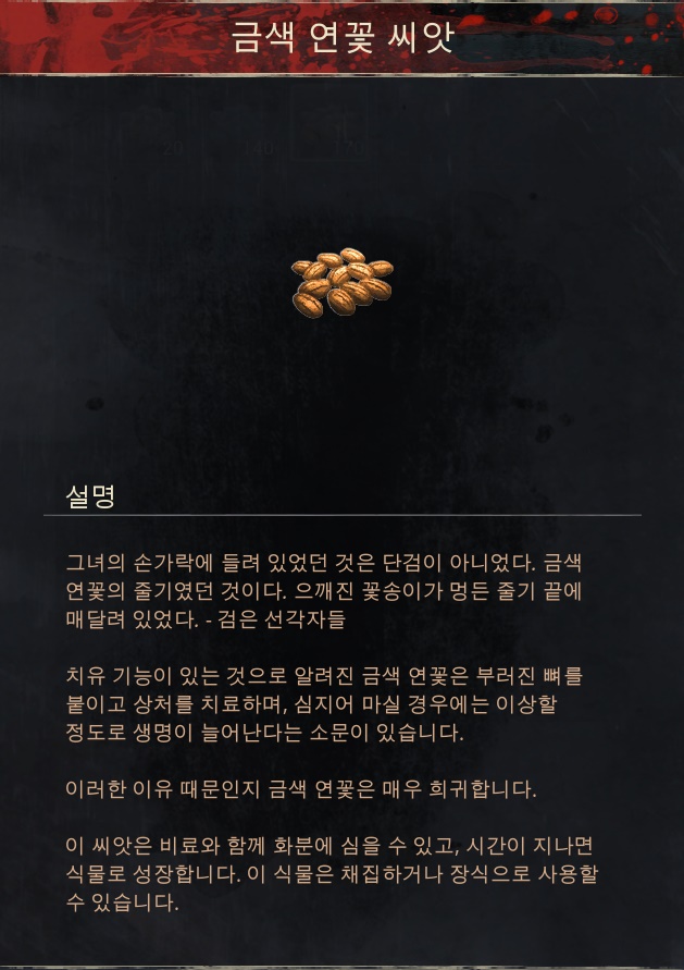 ![]() 획득 방법 1.화산지대에서 위와 같이 생긴 식물을 맨손,[낫]으로 채집시[금색 연꽃],[금색 연꽃 씨앗]을 획득가능합니다. 2.[화분]에서 [금색 연꽃 씨앗]과 [농축 퇴비]를 재료로 [금색 연꽃]획득 가능. 사용처 1.[연금술사 작업대]에서 [물이 담긴 유리병],[금색 연꽃],[연금술 원재]를 사용해 [금색 연꽃 물약]획득 가능. ※[금색 연꽃 물약]은 버프 물약입니다. 사용시, [투지 증가]-투지3증가,[카리스마 증가]-카리스마 1증가,디버프 [약간의 취기]를 얻습니다. [약간의 취기] 디버프가 종료될시 [두통] 디버프가 발동됩니다. [두통]-최대 지구력이 50만큼 감소했습니다.갈증 속도가 약간 증가했습니다. 2.[건조기]에서 [금색 연꽃]3개를 사용해 [금색 연꽃 씨앗]획득 가능. |