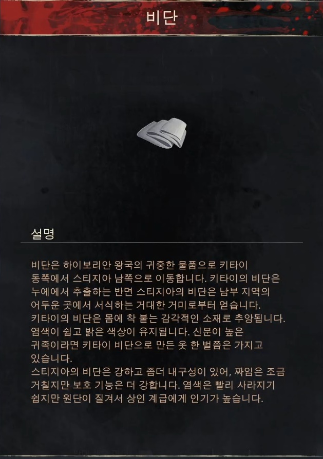 획득 방법 1.[거미줄]2개를 수공예(손)로 [비단]을 제작. 2.[무두장이 작업선반]에 레벨3이상의 [병기 제작자]노예를 투입할 경우 [거미줄]2개를 사용해 [비단]획득 가능. 3.[장인 탁자]에 레벨4 이상의 노예를 투입할 경우 [통통한 굼벵이]10개를 사용해 [비단]획득 가능. 사용처 2.[방어구 제작자 작업대]에서 옷,방어구등 제작에 사용됩니다. |