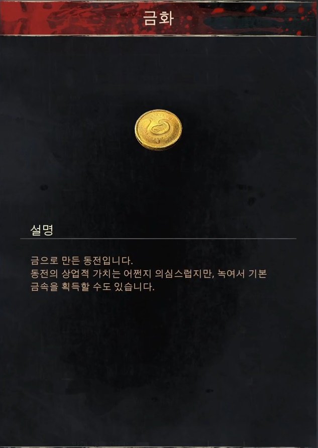 획득 방법 1.[주조 작업선반]에서 [화폐 형틀],[금괴]를 사용해 [금화]획득 가능. 2.몇몇 상자는 [은괴],[은화],[금괴],[금화]중 랜덤으로 드랍하는 상자에서 획득가능합니다. 사용처 1.상인과의 거래에 사용됩니다. 2.[분쇄기]에서 [금화]를 사용해 [금 가루]2개획득 가능. |