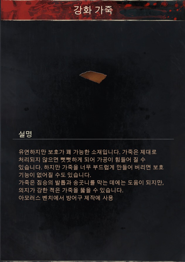 획득 방법 1.[무두장이 작업선반]에서 [가죽],[두꺼운 가죽],[연금술 원재],[기름]을 사용해 [강화가죽]획득 가능. 사용처 1.2.[방어구 제작자 작업대]에서 안감,방어구 제작에 사용됨. |
