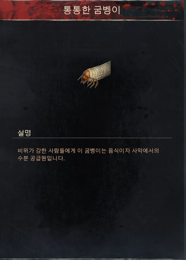 ![]() 획득 방법 1.수풀 사이에서 위와같이 생긴것을 맨손으로 채집시 획득가능. 2.[퇴비 더미]에 [퇴비] 또는 [농축 퇴비]가 1개라도 들어있을시 자동으로 생산됩니다. ※최대50개(1묶음)까지 생산되며 이를 회수하셔야 추가로 생산됩니다. 사용처 1.[물고기 덫],[조개 덫]에서 미끼로서 사용가능. 2.[조리기]에서 [통통한 굼벵이]25개,[그림자 꽃]을 사용해 [그림자 양념으로 양념한 통통한 굼벵이]획득 가능. ※[그림자 양념으로 양념한 통통한 굼벵이]는 동물의 변이를 일으킬때 사용되는 음식이다. 3.[장인 탁자]에 레벨4 이상의 노예를 투입할 경우 [통통한 굼벵이]10개를 사용해 [비단]획득 가능. |