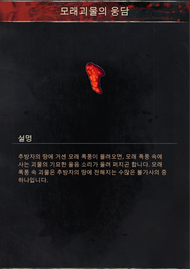획득 방법 1.사막지대에 존재하는 [모래 괴물]을 처치 후 채집시 획득하게 됩니다. 사용처 |