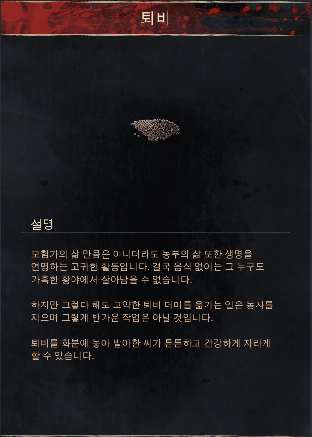 획득 방법 1.[퇴비 더미]에서 [퇴비]2개,[혈액]2개,[식은재]2개를 사용해 [농축 퇴비]획득 가능. 사용처 1.[화분]에서 [농축 퇴비],씨앗 중([노란색 연꽃 씨앗],[선홍색 연꽃 씨앗],[검은색 연꽃 씨앗],[보라색 연꽃 씨앗],등을 사용해 식물을 재배하실수 있습니다. ※[농축 퇴비]로는 식물 씨앗을 재배하실수 없습니다. 2.[퇴비 더미]에 [농축 퇴비]를 넣어 둘시 [통통한 굼벵이]획득 가능. |