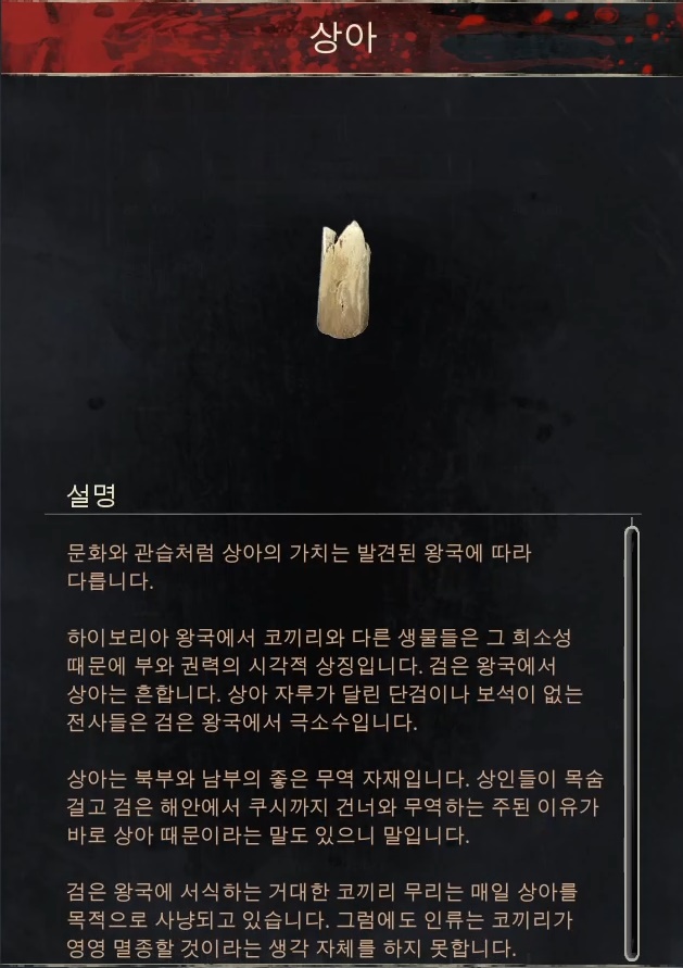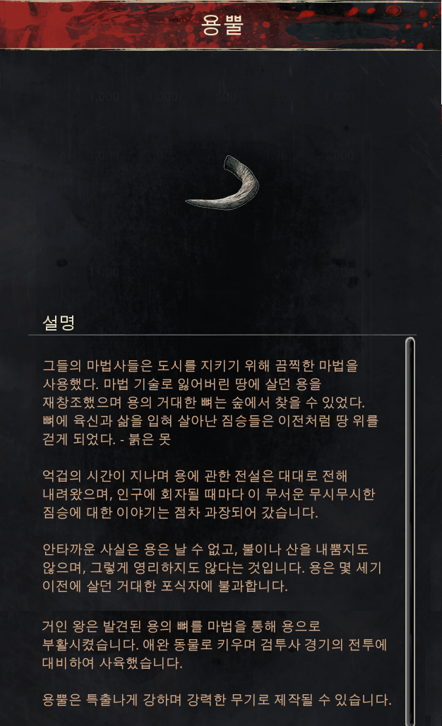 획득 방법 1.악어 등의 몬스터를 처치하고 사체를 채집시 획득가능합니다. 사용처 1.다르파르식 방어구 제작등에 사용됩니다. 2.[분쇄기]에서 [송곳니]를 사용해 [뼛가루]획득 가능. |
