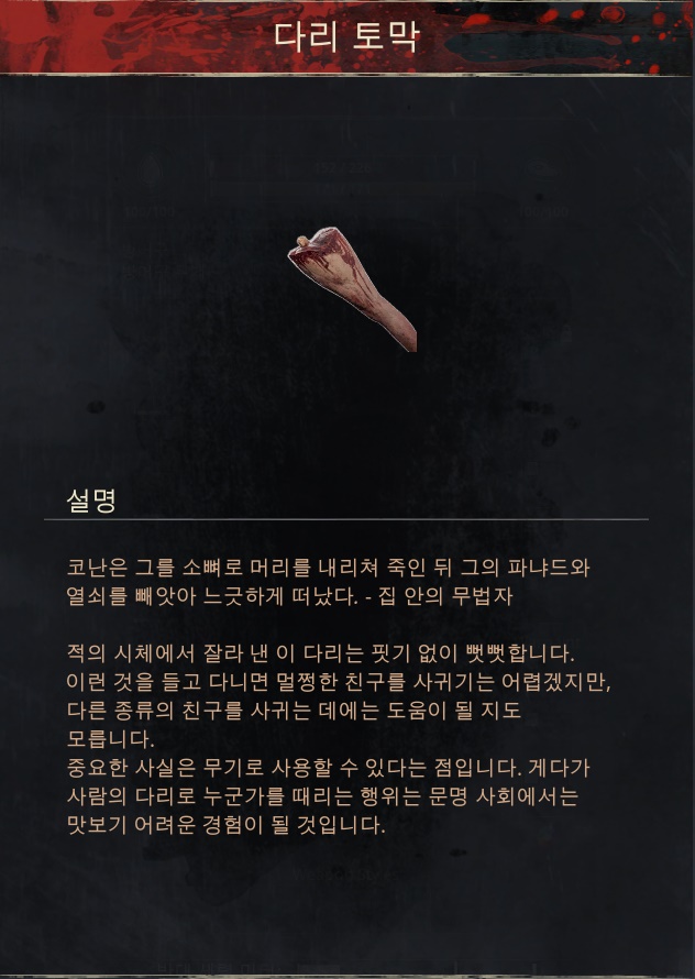 획득 방법 1.인간의 시체를 [도끼],[곡괭이]를 사용하여 채집할시 일정확률로 획득. 사용처 1.무기로 사용가능. 2.[분쇄기]에서 [다리 토막]을 사용해 [뼛가루]2개,[혈액]1개 획득 가능. |
