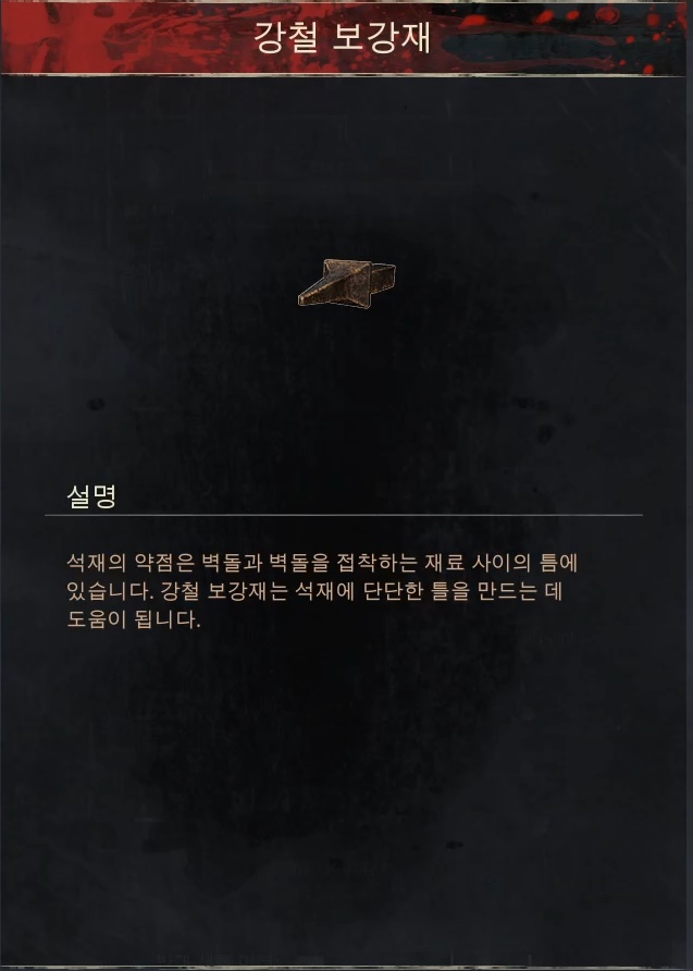 획득 방법 1.[대장장이 작업대]에서 [철괴]2개를 사용해 [철 보강재]획득 가능. 사용처 1.건물건설 재료에 사용됩니다. 2.[대장장이 작업대]에 레벨3이상의 [대장장이]노예를 투입할 경우 [철 보강재],[스틸파이어]를 사용해 [강철 보강재]획득 가능. |