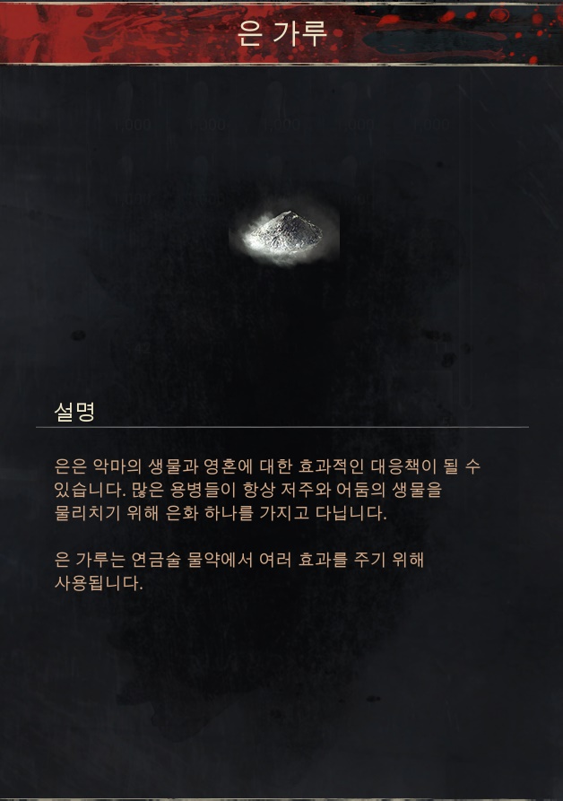 획득 방법 1.[분쇄기]에서 [은괴]를 사용해 [은 가루]10개획득 가능. 2.[분쇄기]에서 [은화]를 사용해 [은 가루]2개획득 가능. 사용처 1.[화로 가마솥]에서 [은 가루]2개,[금 가루],[이코르]를 사용해 [연금술 원재]획득 가능. |