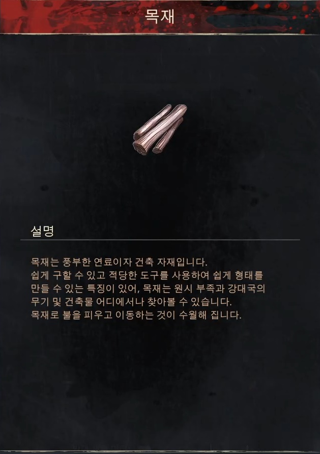 획득 방법 1.[도끼]를 사용하여 나무에서 채집 2.[목수 작업대]에 레벨3이상의 [목수]노예를 투입할 경우 [나뭇가지]10개로 [목재] 1개 제작가능. 사용처 1.도구,건물등 다양한 제작 재료로 사용됨. 2.[건조기]에서 [나무껍질]과 [목재]를 재료로 [건조한 목재],[송진]획득 가능. 3.[목수 작업대]에서 [목재]10개를 재료로[모양 잡힌 목재]로 제작 가능. 4.[목수 작업대]에서 [목재]10개를 재료로[나무껍질]로 제작 가능. 5.[목수 작업대]에 레벨3이상의 [목수]노예를 투입할 경우 [목재]1개로 [나뭇가지] 2개 제작가능. |
