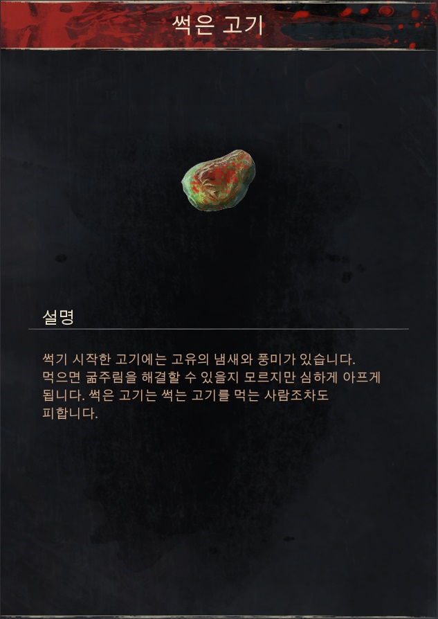 획득 방법 1.각종 음식류가 시간제한이 지날경우 [썩은 고기]를 획득하게 됩니다.(고기류,물고기류,요리한 음식들등등) 2.해골,부활한 괴물,질의 후예등등 몬스터를 처치후 [도끼],[곡괭이]등을 사용해 채집할경우 획득합니다. 사용처 1.사용시 배고픔을 채워주며, [식중독] 디버프를 얻습니다. 2.[퇴비 더미]에서 [식물 섬유],[썩은 고기],[뼛가루]를 사용해 [퇴비]획득 가능. 3.[액체 압축기]에서 [썩은 고기]50개를 사용해 [이코르]획득 가능. 2.[조리기]에서 [썩은 고기]100개,[그림자 꽃]을 사용해 [그림자 양념으로 양념한 썩은 고기]획득 가능. ※[그림자 양념으로 양념한 썩은 고기]는 동물의 변이를 일으킬때 사용되는 음식이다. |