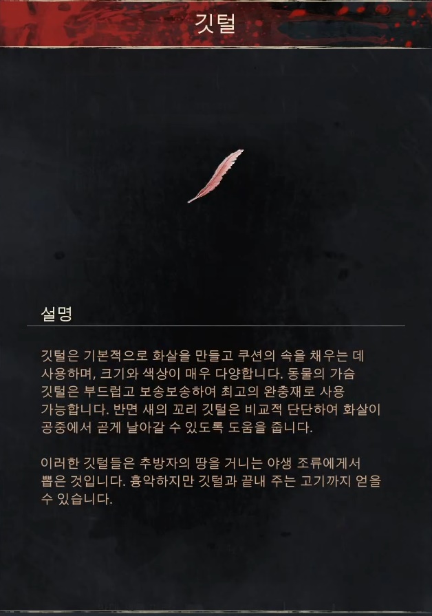 획득 방법 1.새의 둥지(높은 언덕,타조 둥지등)에서 깃털 획득가능. 2.조류형(타조,슈빌,질의 후예등) 몬스터 시체에서 채집시 획득가능. 사용처 1.[목수 작업대]에서 화살을 제작할때 사용함. |