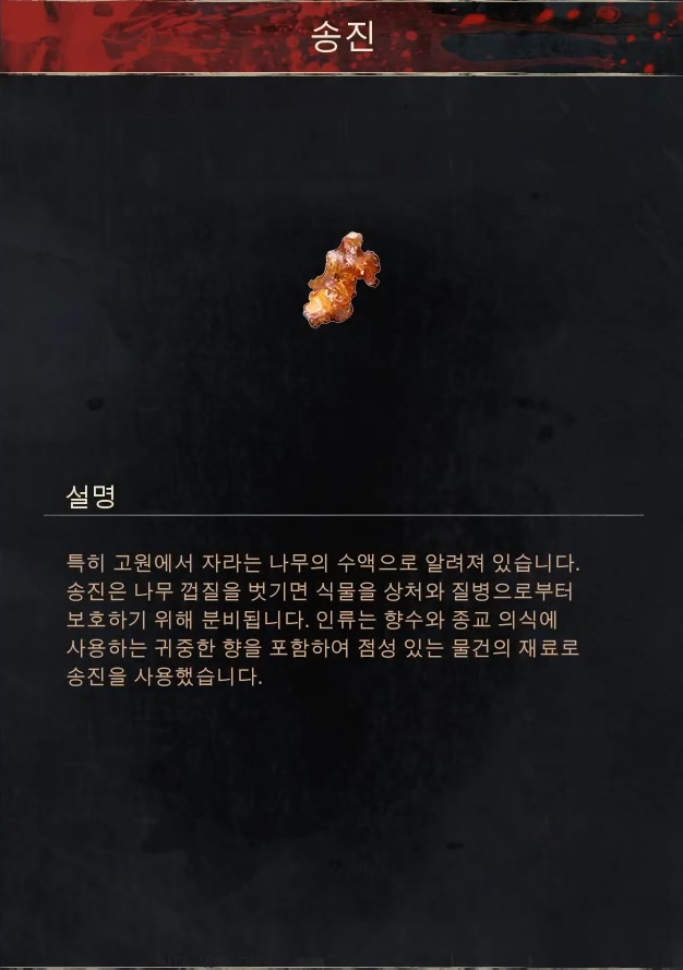 획득 방법 1.[곡괭이]를 사용하여 나무에서 채집가능. 2.[건조기]에서 [나무껍질]과 [목재]를 재료로 [건조한 목재],[송진]획득 가능. 사용처 1.[목수 작업대]에서 [송진]과 [건조한 목재]를 재료로 [단열 목재]획득 가능. 2.[화로 가마솥]에서 [송진]2개,[식물 섬유]6개를 사용해 [돌 유합제]획득 가능. 3.[연금술사 작업대]에 레벨3이상의 노예를 투입할 경우 [송진]10개,[식은재]10개를 사용해 [타르]획득 가능. |