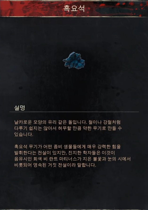 획득 방법 1.흑요석을 캘경우 [흑요석],[식은재],[크리스탈],[석재],[금광석]을 획득할수있습니다. ※[낫]으로 캘경우 [식은재]를 많이 획득하실수있습니다. 사용처 1.[퇴비 더미]에서 [퇴비]2개,[혈액]2개,[식은재]2개를 사용해 [농축 퇴비]획득 가능. 2.[연금술사 작업대]에서 [물이 담긴 유리병],[노란색 연꽃],[식은재],[뼛가루]를 사용해 [자연적인 학습의 물약]획득 가능. ※[자연적인 학습의 물약]은 특성 점수를 재설정하는 물약입니다. 3.[연금술사 작업대]에서 [물이 담긴 유리병],[노란색 연꽃],[식은재],[혈액]을 사용해 [짐승의 기억의 물약]획득 가능. ※[짐승의 기억의 물약]은 속성 점수를 재설정하는 물약입니다. |