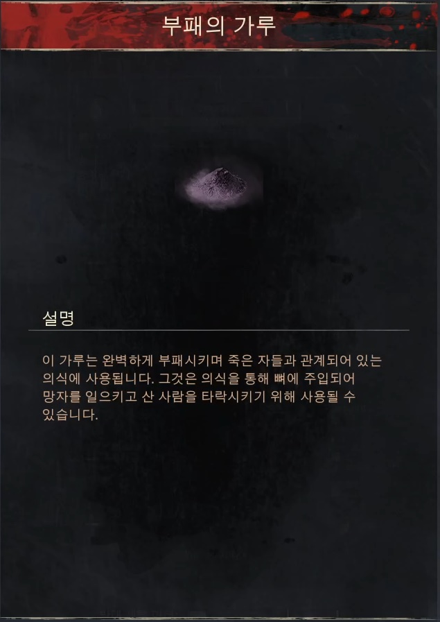획득 방법 1.[소환 지점]에 있는 상자를 개봉시 소량의 [부패의 가루]획득 가능. 사용처. 1.[화로 가마솥]에서 [뼈]20개,[부패의 가루]를 사용해 [오염된 뼈]획득 가능. ※[오염된 뼈]제작법을 획득하기 위해서는 [소환 지점]에서 [마녀 의사]업적을 획득하셔야합니다. 획득위치는 아래쪽에 추가 작성한 [마녀 의사] 로 검색하세요. |