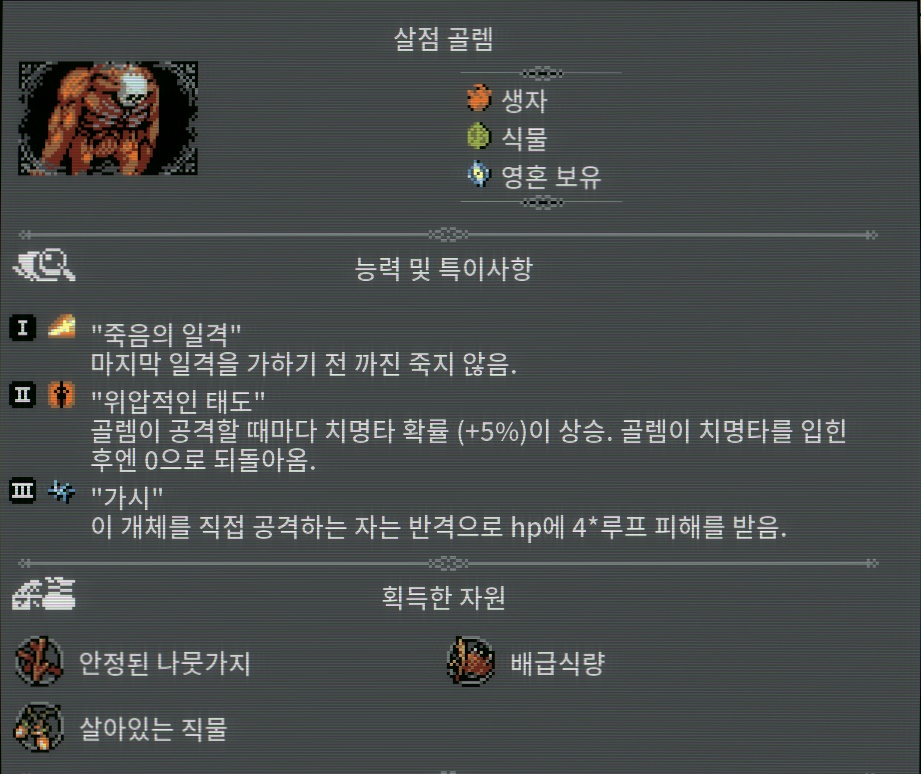 ※[피투성이 수풀],[굶주린 수풀]이 영혼을 8개 정도 흡수할시 [살점 골렘]을 소환합니다. [굶주린 수풀]은 [살점 골렘]의 [죽음의 일격]을 무효화시킬수있습니다. [피투성이 수풀]은 효과가없습니다.