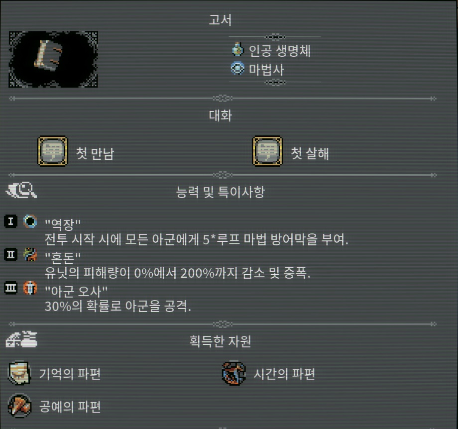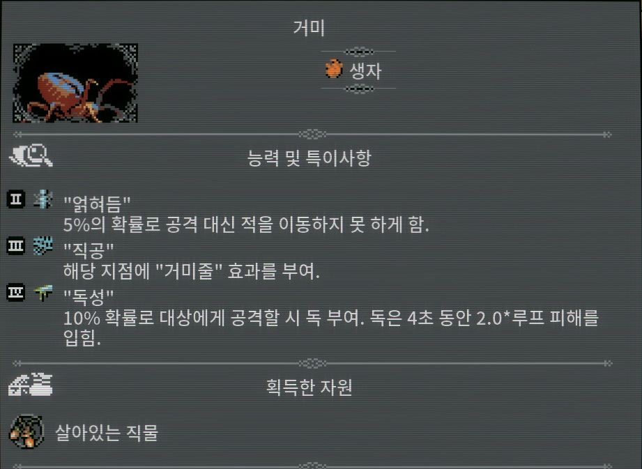 [유적] ●방문할 때마다 무작위 자원 조각 획득. ●2일 마다 화염 벌레를 하나 소환. ※[화염 벌레]는 인접한 타일에서 전투시 지원사격을합니다.