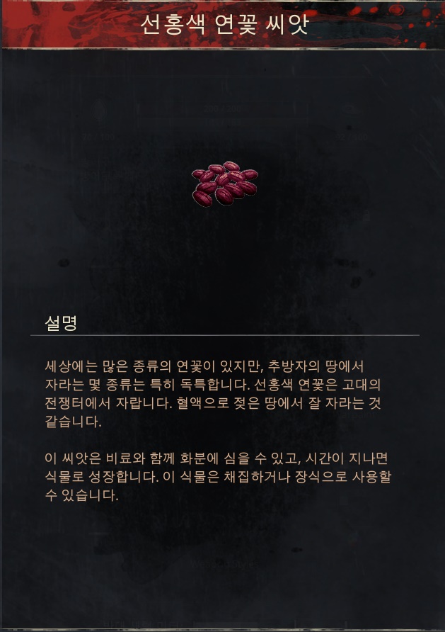 획득 방법 1.[시체 더미]근처에서 위와 같이 생긴 식물을 맨손,[낫]으로 채집시 [선홍색 연꽃],[선홍색 연꽃 씨앗] 획득가능. 2.[건조기]에서 [선홍색 연꽃]3개를 사용해 [선홍색 연꽃 씨앗]획득 가능.