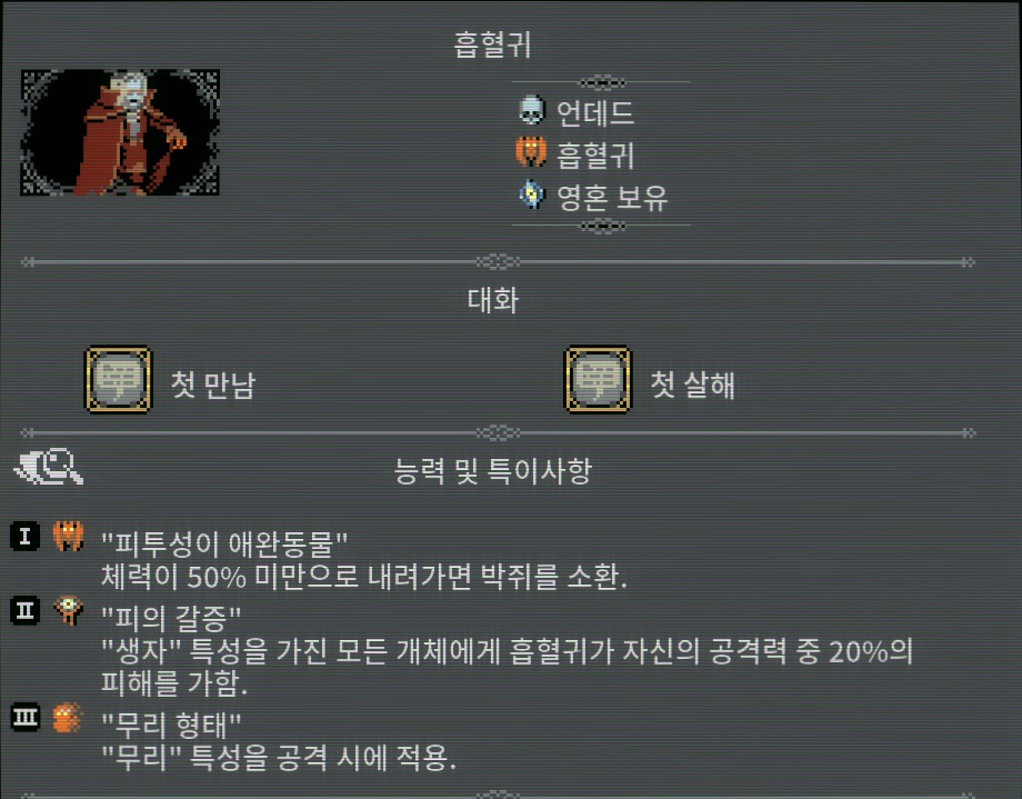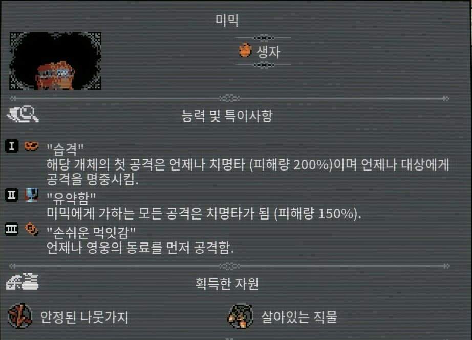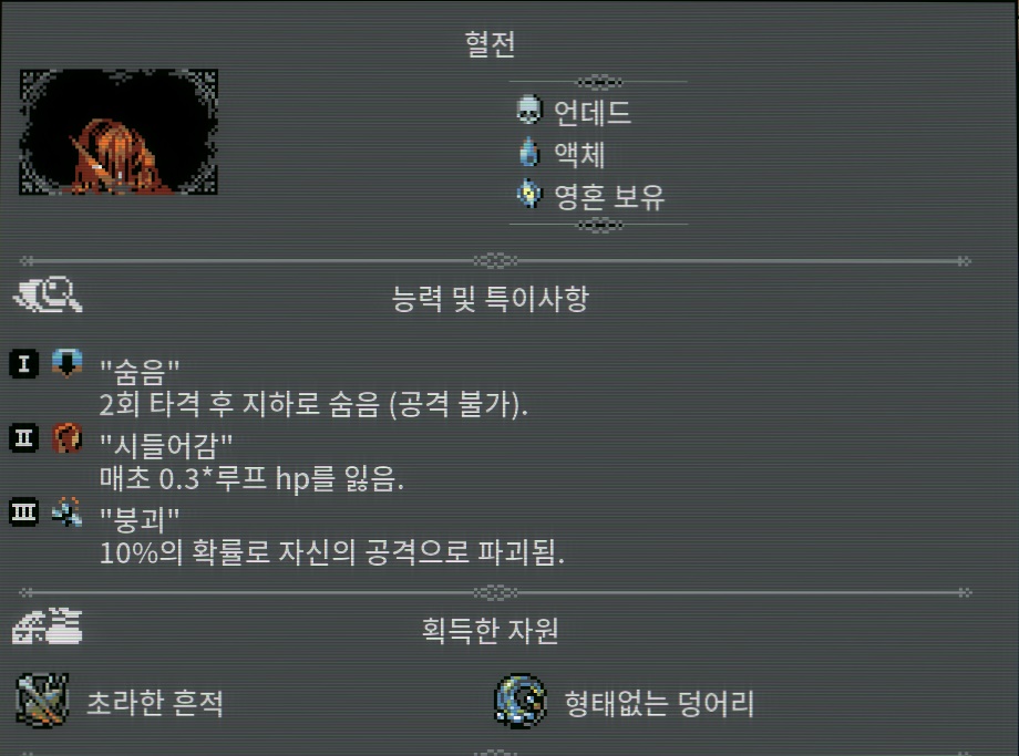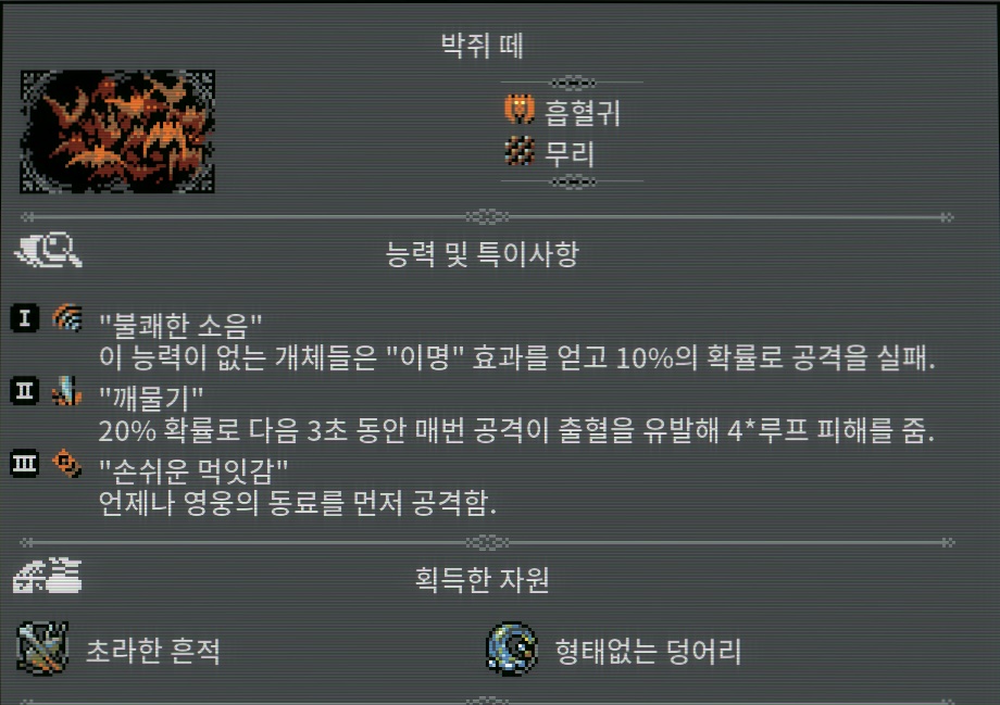 [늪] ●3일 마다 한 번씩 모기 하나를 소환. ●여기선 모든 회복 효과가 반대로 적용.포션 제외,포션은 여전히 당신의 편이다. ※개구리 왕은 황무지를 [늪]으로 모두 채워야 등장한다고 합니다. [늪]으로 모두 채운다고 하여도 리스폰 될 확률은 극히 낮습니다. 스킬중 [99% ???]는 회피로 추정됨. 백과사전에 등록되지 않은 몬스터입니다.