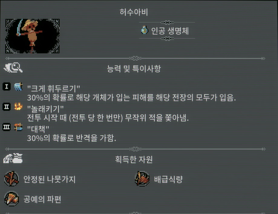 [밀밭] ●마을 옆에만 배치 가능. ●인접한 마을에서 제공하는 회복량 +[5*루프]HP. ●4일에 하나씩 허수아비 소환.