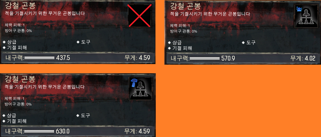 체력 피해:★★★ 방어구 관통:동일 내구력:★★ 무게:★