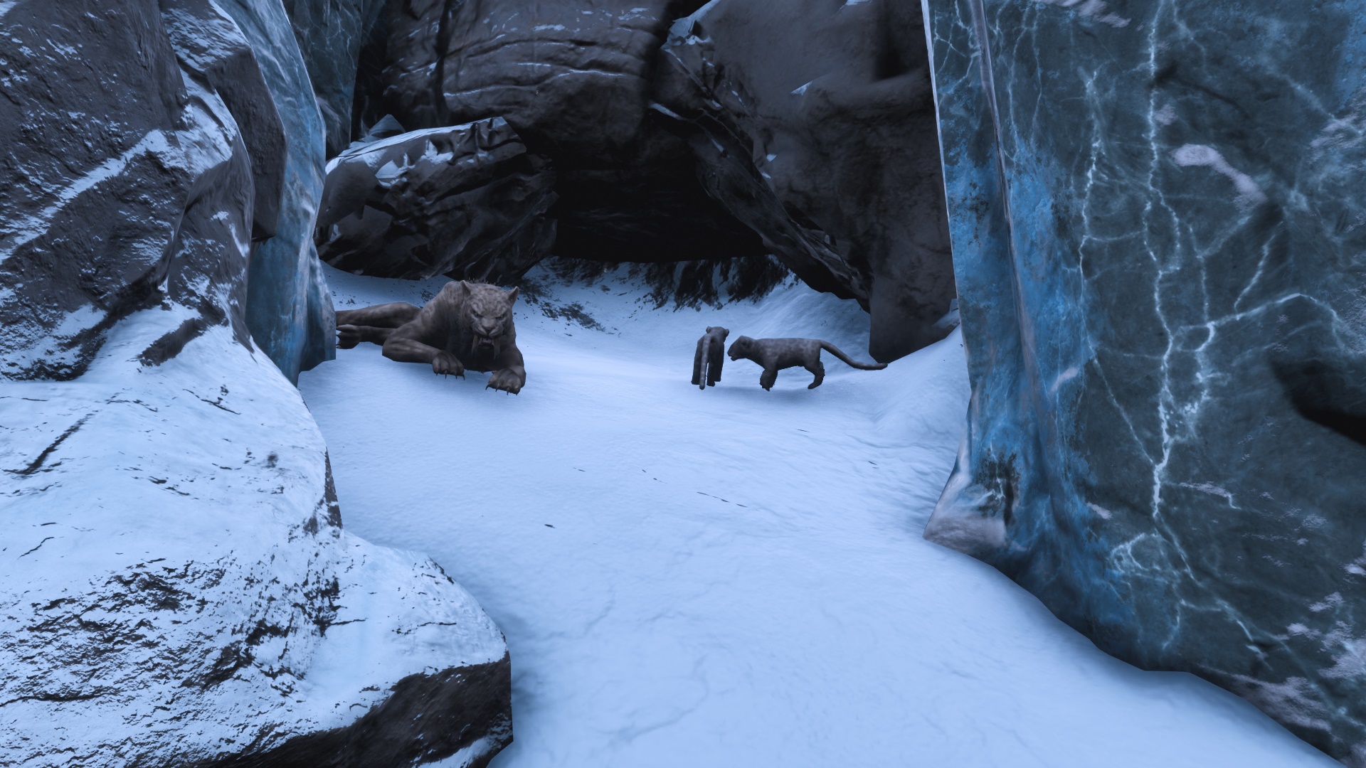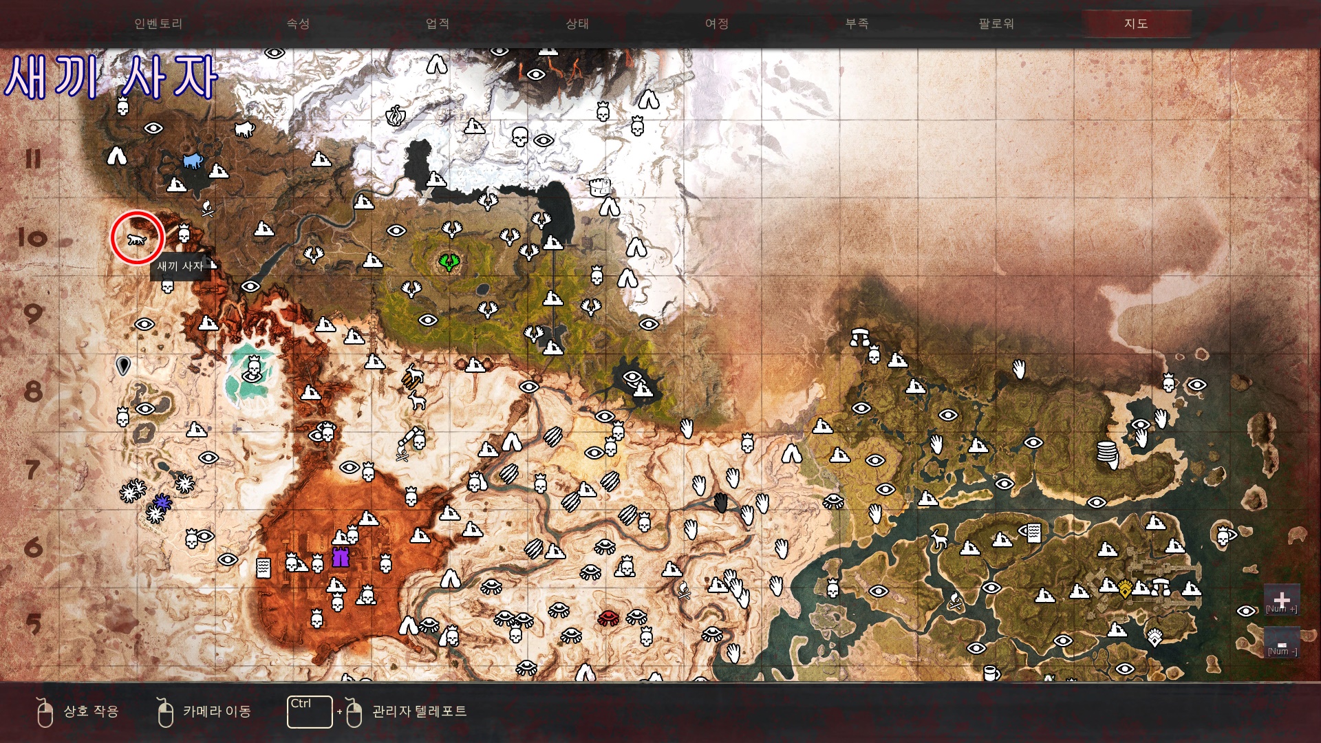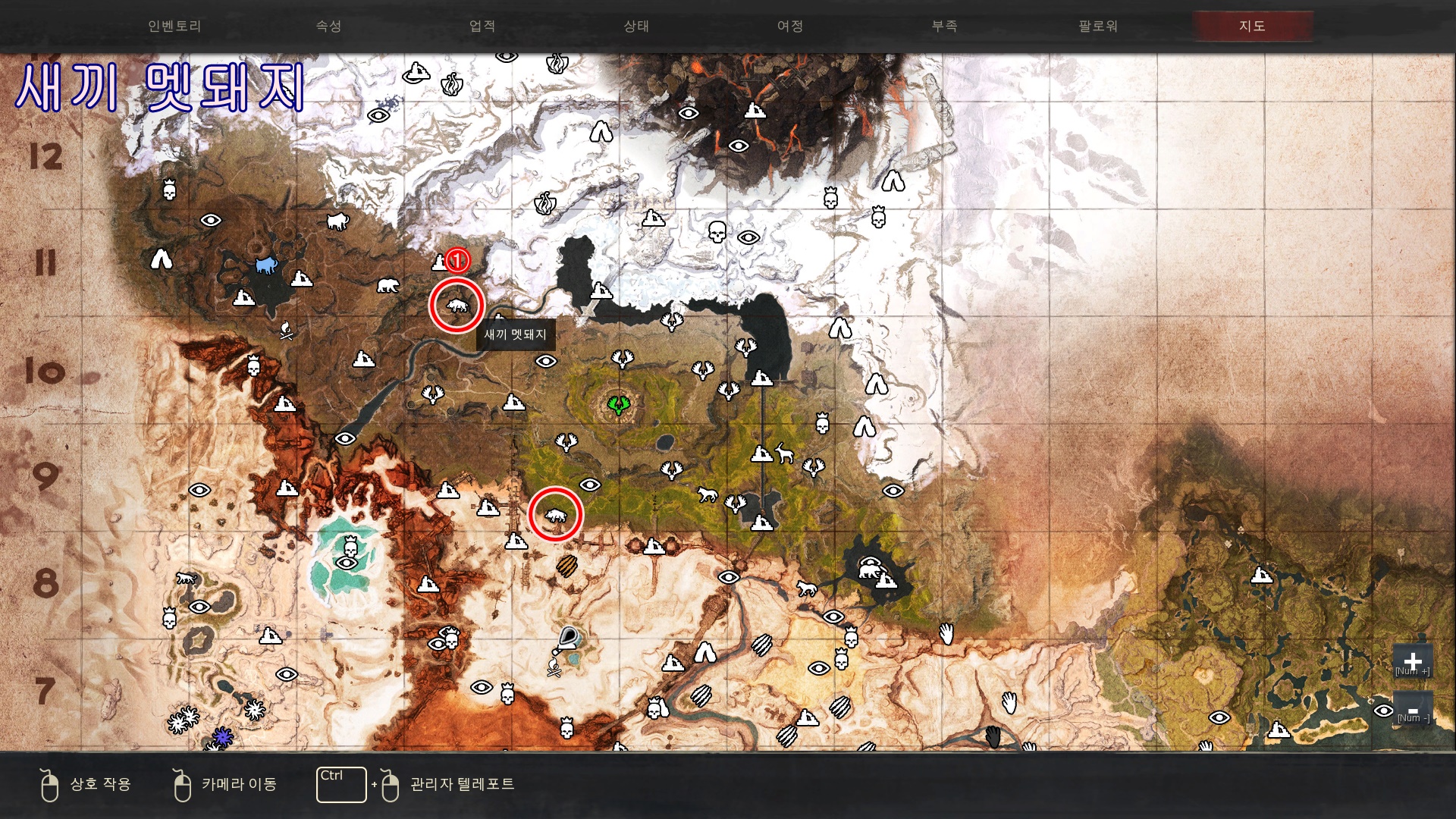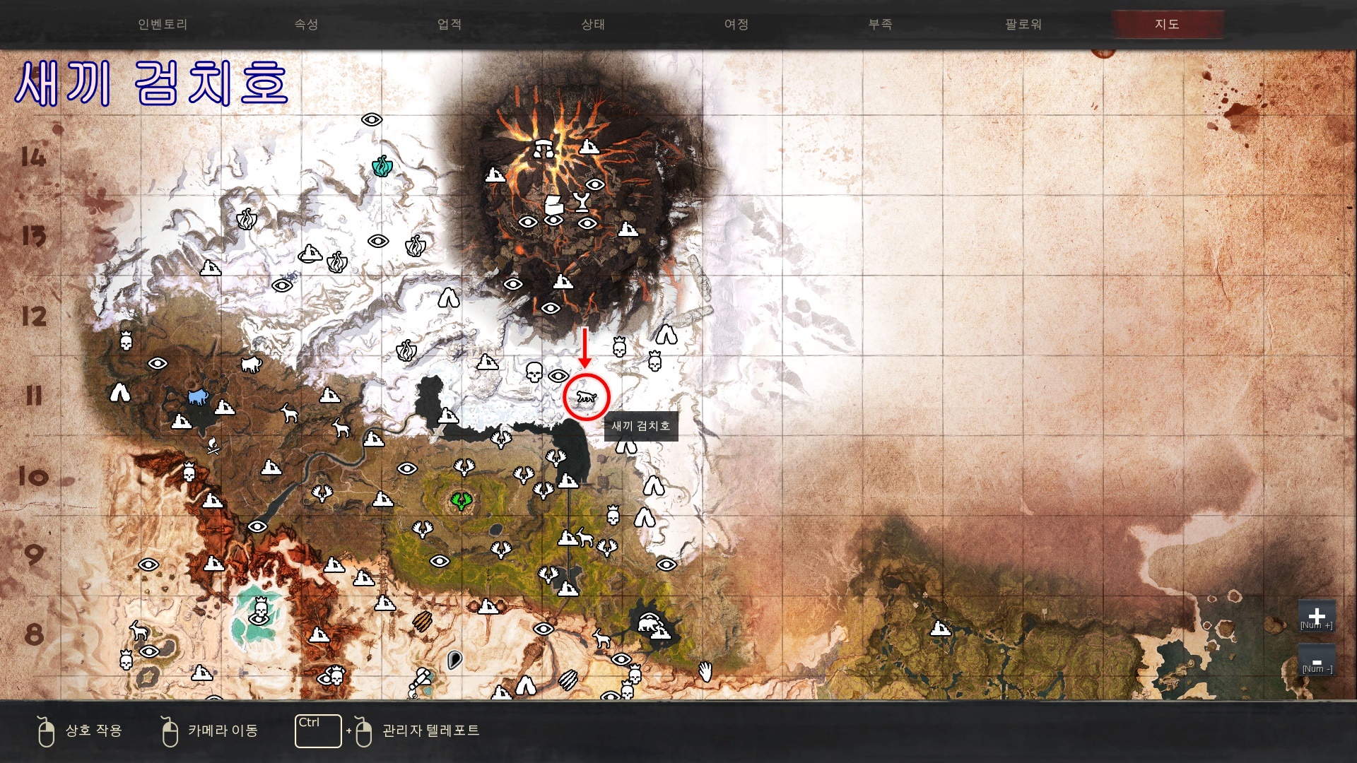 새끼 검치호의 경우 [얼음 나선 협곡] 내부의 구석진곳에 자그마한 굴같이 보이는곳에 있습니다. 해당 표시한 위치위쪽이 아닌 협곡 아래쪽으로 내려오셔서 찾으셔야합니다.