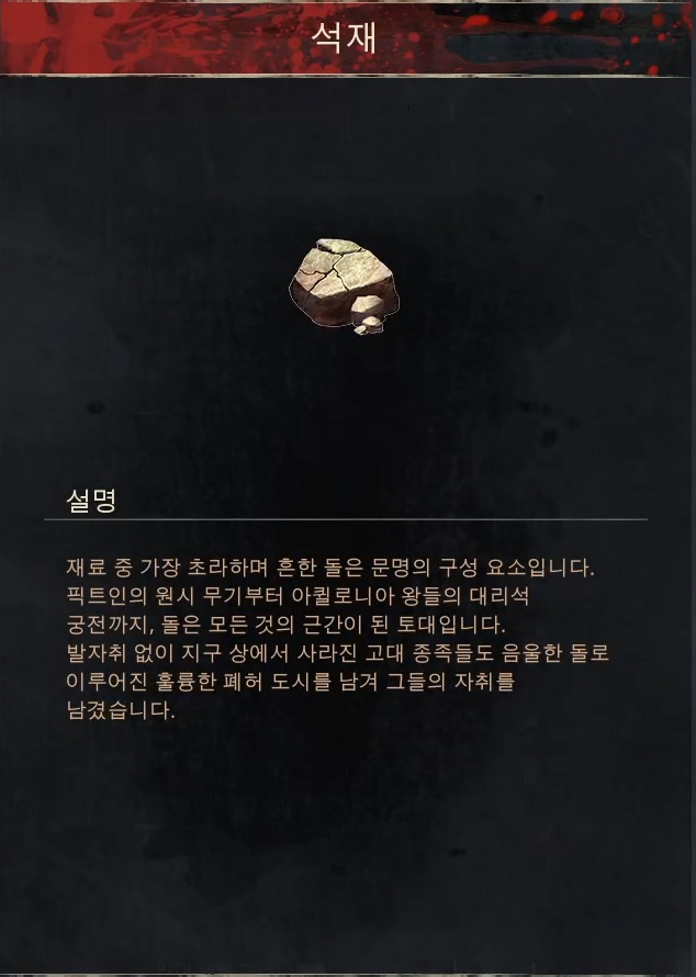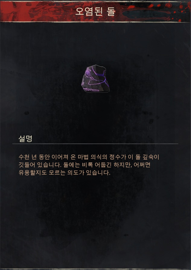 획득 방법 1.[연금술사 작업대]에서 [돌]2개,[이코르],[악마의 피]를 사용해 [오염된 돌] 획득 가능. ※[기록 보관소]안쪽에 있는 기록 관리자 에게서 [(지도 제작자)학습하기] 를통해 레시피를 해금하실수 있습니다.