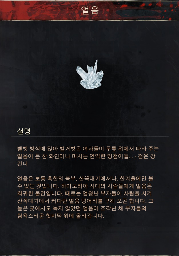 사용처 1.[분쇄기]에서 [얼음 연꽃]을 사용해 [얼음 연꽃 가루]획득 가능. 2.[연금술사 작업대]에서 [물이 담긴 유리병],[얼음 연꽃],[연금술 원재]를 사용해 [얼음 연꽃 물약]획득 가능. ※[얼음 연꽃 물약]은 버프 물약입니다. 사용시, [투지 증가]-투지3증가,[힘 증가]-힘 3증가,디버프 [약간의 취기],[중독됨]을 얻습니다. [약간의 취기] 디버프가 종료될시 [두통] 디버프가 발동됩니다. [두통]-최대 지구력이 50만큼 감소했습니다.갈증 속도가 약간 증가했습니다. [중독됨] - 매 초마다 2포인트 피해를 입습니다.(짧게 지속됨) 3.[건조기]에서 [얼음 연꽃]3개를 사용해 [얼음 연꽃 씨앗]획득 가능.
