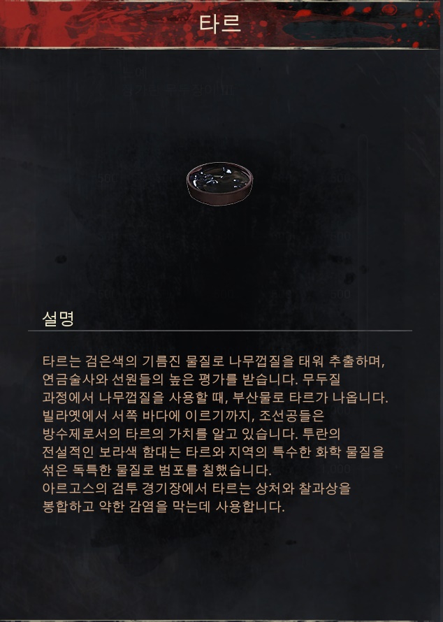 사용처 1.[퇴비 더미]에서 [퇴비]2개,[혈액]2개,[식은재]2개를 사용해 [농축 퇴비]획득 가능. 2.[연금술사 작업대]에서 [물이 담긴 유리병],[노란색 연꽃],[식은재],[뼛가루]를 사용해 [자연적인 학습의 물약]획득 가능. ※[자연적인 학습의 물약]은 특성 점수를 재설정하는 물약입니다. 3.[연금술사 작업대]에서 [물이 담긴 유리병],[노란색 연꽃],[식은재],[혈액]을 사용해 [짐승의 기억의 물약]획득 가능. ※[짐승의 기억의 물약]은 속성 점수를 재설정하는 물약입니다.